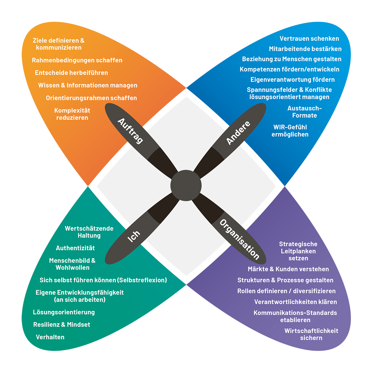Zunehmende Komplexität (Bsp. VUCA), gesellschaftlicher Wandel oder der Impact von digitalen Technologien, neuen Arbeitsweisen und guter Zugang zu Wissen und Informationen machen Führung heute zum einen spannender, aber auch anspruchsvoller. Führungskräfte übernehmen verschiedene Rollen. Als Leader, Experte, Coach oder Manager benötigen für diese verschiedenen Rollen unterschiedliche Kompetenzen. In Verbindung zu Auftrag, eigener Organisation und spezifischer Situation werden Führungskräfte entsprechend enorm gefordert. Gleichzeitig fühlen sie sich häufig auf sich allein gestellt und in ihrer aktuellen Führungsrolle enorm belastet und gefordert, zuweilen sogar überfordert. Basierend auf dem eigens für die Entwicklung von Führungskräften angelegten «Leadership-Prop» (s. Grafik unten) können Führungskräfte zielgerichtet in ihrer eigenen Führungs-Situation unterstützt werden, um Übersicht, Klarheit und vor allem ganz konkrete Handlungsansätze zu entwickeln.